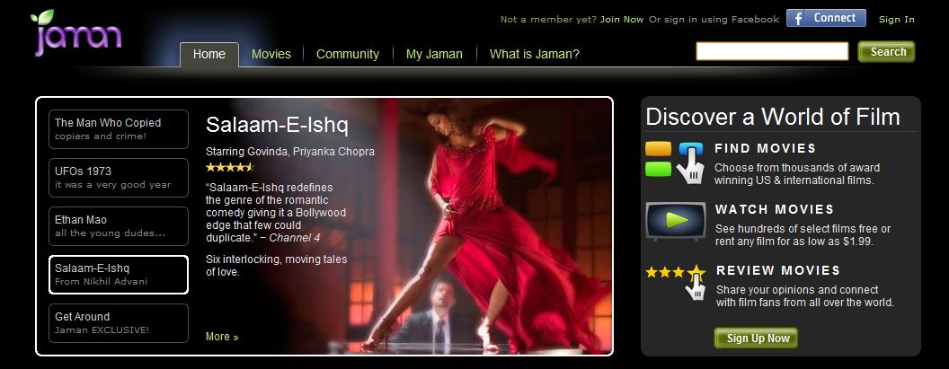 Si eres productor de cine independiente puedes llenar un formulario y colocar tu contenido en Jaman y elegir entre distribuir tu película gratuitamente para que todos la conozcan, alquilarla vía streaming de flash o venderla en formato de alta definición, generando ingresos que tal vez no esperabas.